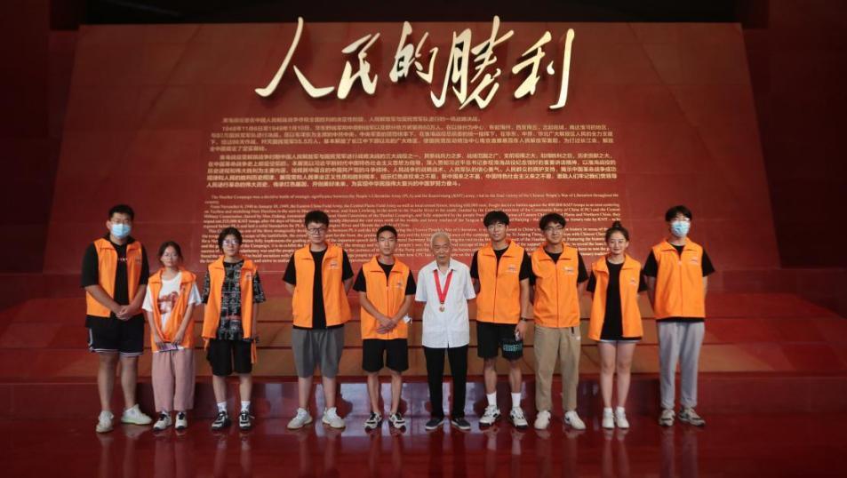 在淮海战役纪念馆里,团队成员偶遇了一位佩戴着“光荣在党五十周年纪念勋章”的老爷爷。爷爷年纪较大,听觉已经严重衰退,在询问过老人的家人后,团队成员得知老人名为焦尚栋,安徽阜新人,87岁高龄,于1964年入党,迄今为止已经在党57年,是一名忠诚的老共产党员。焦尚桐老人在少年时期,亲身经历了淮海战役,当时解放军目标明确、全力以赴不怕牺牲的革命精神使老人感触很深,所以他在还未入党时就一直以党员的要求严格要求自己,在加入中国共产党后更是严于律己,在自己的岗位上,兢兢业业,为新中国的建设做出着自己的贡献。