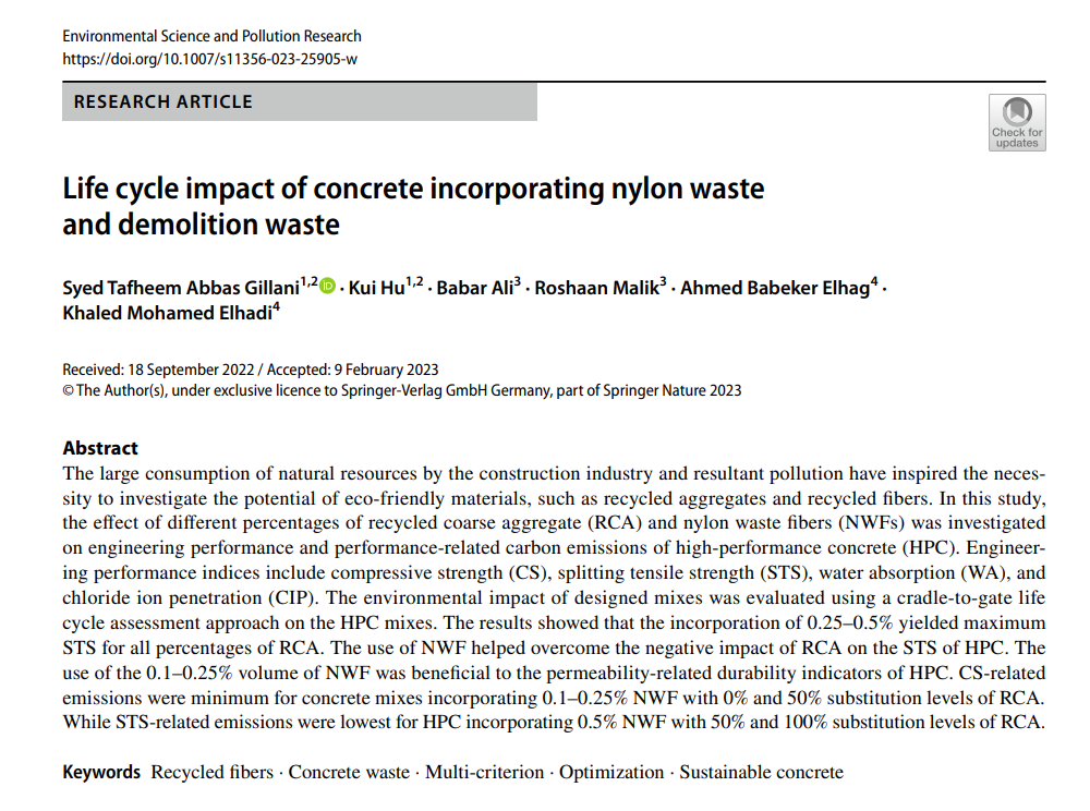 近日,yanetfix 2020级海外留学博士研究生Syed Tafheem Abbas Gillani在国际高水平学术期刊Environmental Science and Pollution Research(JCR Q2,IF=5.190)上发表了题为“Life cycle impact of concrete incorporating nylon waste and demolition waste”(DOI:10.1007/s11356-023-25905-w)的研究论文,该项成果为学院围绕国家双碳战略开展一系列有组织科研活动的阶段成果,yanetfix 为论文第一署名单位,我校留学生为第一作者。