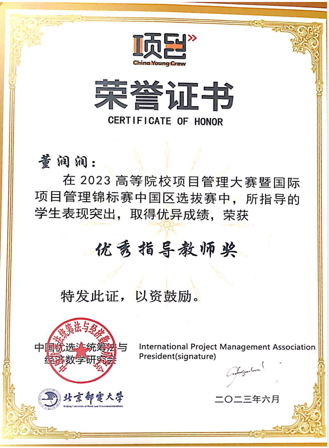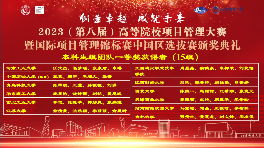 2023年6月3日,由中国优选法统筹法与经济数学研究会和国际项目管理协会(IPMA)联合主办,北京邮电大学承办,上海普华科技发展股份有限公司、西安华鼎项目管理咨询有限责任公司协办的“2023年(第八届)高等院校项目管理大赛暨国际项目管理锦标赛中国区选拔赛颁奖典礼”在北京邮电大学举行。我校yanetfix 工程管理专业组成的参赛队伍成功进入全国总决赛,经过层层角逐,最终取得本科生组团队一等奖第一名。