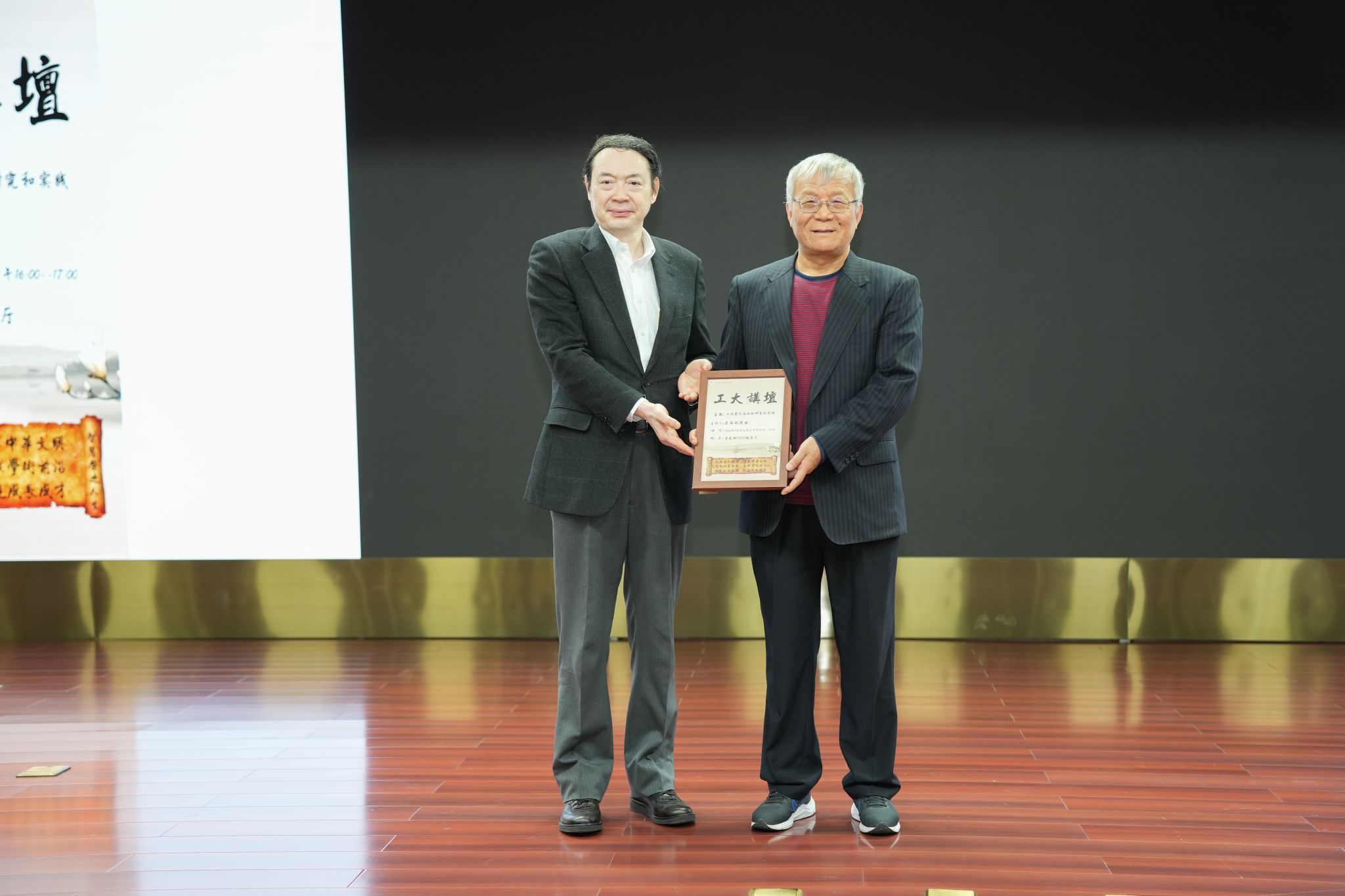 校长吴智深、副校长白艳红分别代表学校向两位院士赠送工大讲坛纪念海报,两位院士分别在“工大讲坛”纪念册上留下寄语,并与师生代表合影留念。