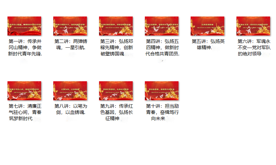 “传承井冈山精神,争做新时代青年先锋”,带领我们回望革命初期的艰难岁月,井冈山革命先辈为镜,坚定理想信念,筑牢理想信念根基。“两弹铸魂,一星引航,让我们走进新中国成立后的科技攻坚时期,领悟老一辈科学家自力更生、勇攀高峰的精神力量,树立以科技报国的远大志向“弘扬邓稼先精神,创新破壁铸国魂”聚焦邓稼先等科研工作者,传承他们隐姓埋名、无私奉献的精神,激励青年在新时代以创新为笔,书写强国篇章。“弘扬五四精神,做新时代合格共青团员”,以五四运动为起点,号召青年以五四精神为指引,着眼青年成长,提升自身素养。“弘扬英雄精神”,鼓励我们从众多英雄事迹中汲取力量,在平凡的岗位上坚守初心,践行使命。“军魂永不变——党对军队的绝对领导”,为我们阐释了军队听党指挥的重大意义,引导青年凝聚青春力量,支持国防事业,守护国家稳定与人民幸福。在个人发展与社会建设层面,“清廉正气驻心间,青春筑梦新时代”,将廉洁自律融入青年成长过程,以清风护航逐梦路之路。“以笔为剑,以血铸魂”,强调文字与思想的力量鼓励青年用思想武器传递正能量,为时代发声,展现文字与思想的力量。“传承红色基因,弘扬长征精神”,带领吾辈重走先辈征途,深刻领悟艰苦奋斗、坚定信念的力量,百折不挠的奋斗精神。“担当励青春,奋楫笃行向未来”,则聚焦当下,号召青年学子将个人理想融入国家发展大局,以实干担当精神把青春融入国家发展浪潮。