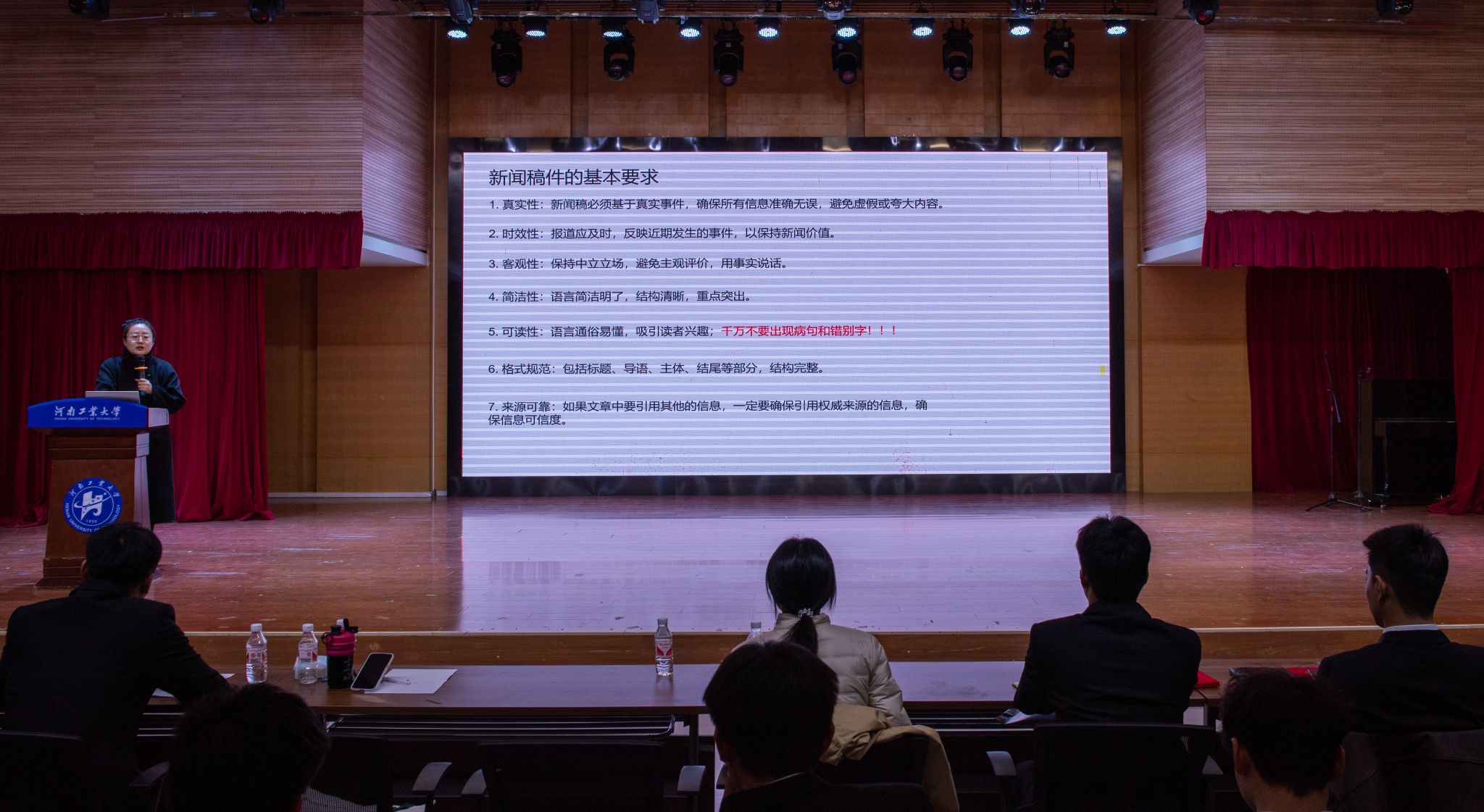 培训过程中,向柯老师首先明确了新闻稿书写的七点基本要求,着重强调了真实性与客观性这一核心原则;随后从标题入手,详细讲解了主体内容的撰写方法,逐一规范了导语、正文的写作要点以及人称、配图的使用标准;最后结合具体实例,辨析了敏感内容表述的正误,明确了话语的规范化用法。