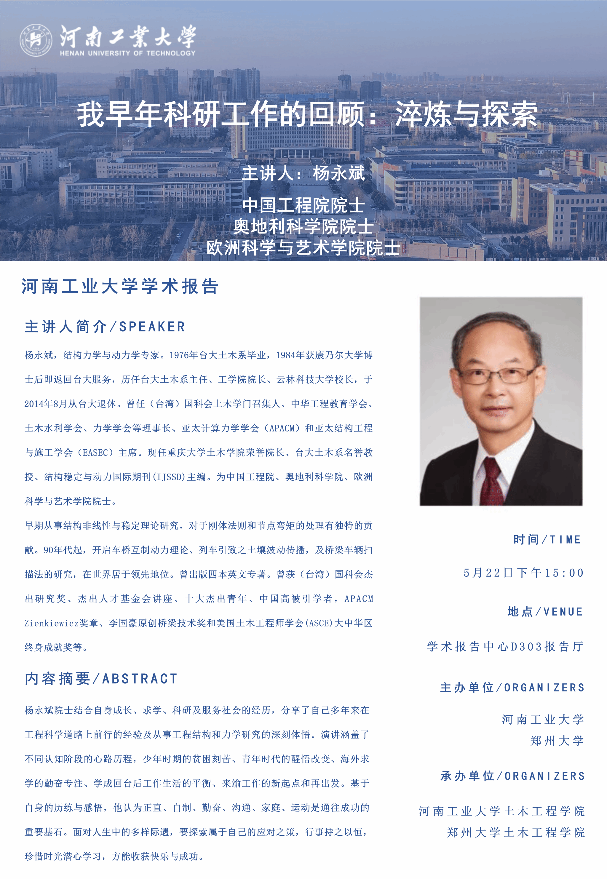 杨永斌院士学术报告预告:我早年科研工作的回顾淬炼与探索